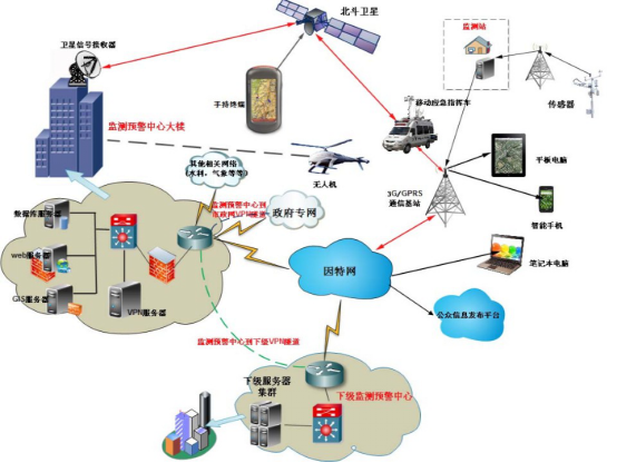 地質(zhì)災(zāi)害監(jiān)測預(yù)警智慧管理系統(tǒng)綜合利用計算機網(wǎng)絡(luò)技術(shù)、地理信息系統(tǒng)技術(shù)、衛(wèi)星導(dǎo)航定位與通信技術(shù)、遙感技術(shù)、自動監(jiān)測技術(shù)等,實現(xiàn)地質(zhì)災(zāi)害自動監(jiān)測與預(yù)警、信息發(fā)布、救援指揮和管理等功能。