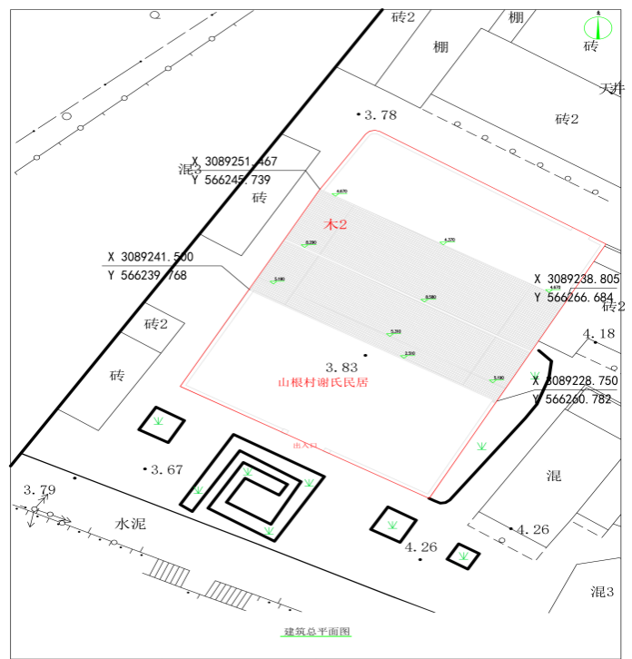 總平面圖:繪制建筑輪廓、周邊建筑或構(gòu)筑物、道路、廣場(chǎng)、水域、山體、綠化等環(huán)境信息,且完整覆蓋歷史環(huán)境要素;標(biāo)注建筑總尺寸,建筑與相鄰建筑物、構(gòu)筑物的距離;場(chǎng)地標(biāo)高與建筑、構(gòu)筑物的標(biāo)高,平屋面建筑標(biāo)注天面、女兒墻的標(biāo)高,坡屋面建筑宜標(biāo)注屋脊、檐口下沿的標(biāo)高;標(biāo)注建筑名稱、出入口位置、層數(shù)、建筑高度、周邊建筑的層高、周邊道路、廣場(chǎng)名稱等信息。