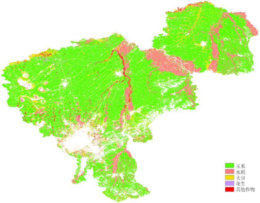 利用遙感數(shù)據(jù)的可見光、近紅外和短波紅外波段,輔以土地利用現(xiàn)狀數(shù)據(jù)、地面調(diào)查數(shù)據(jù)、農(nóng)業(yè)歷史統(tǒng)計數(shù)據(jù)等,通過分析各類農(nóng)作物在不同物候期的光譜特征、紋理特征,實現(xiàn)農(nóng)作物分類。