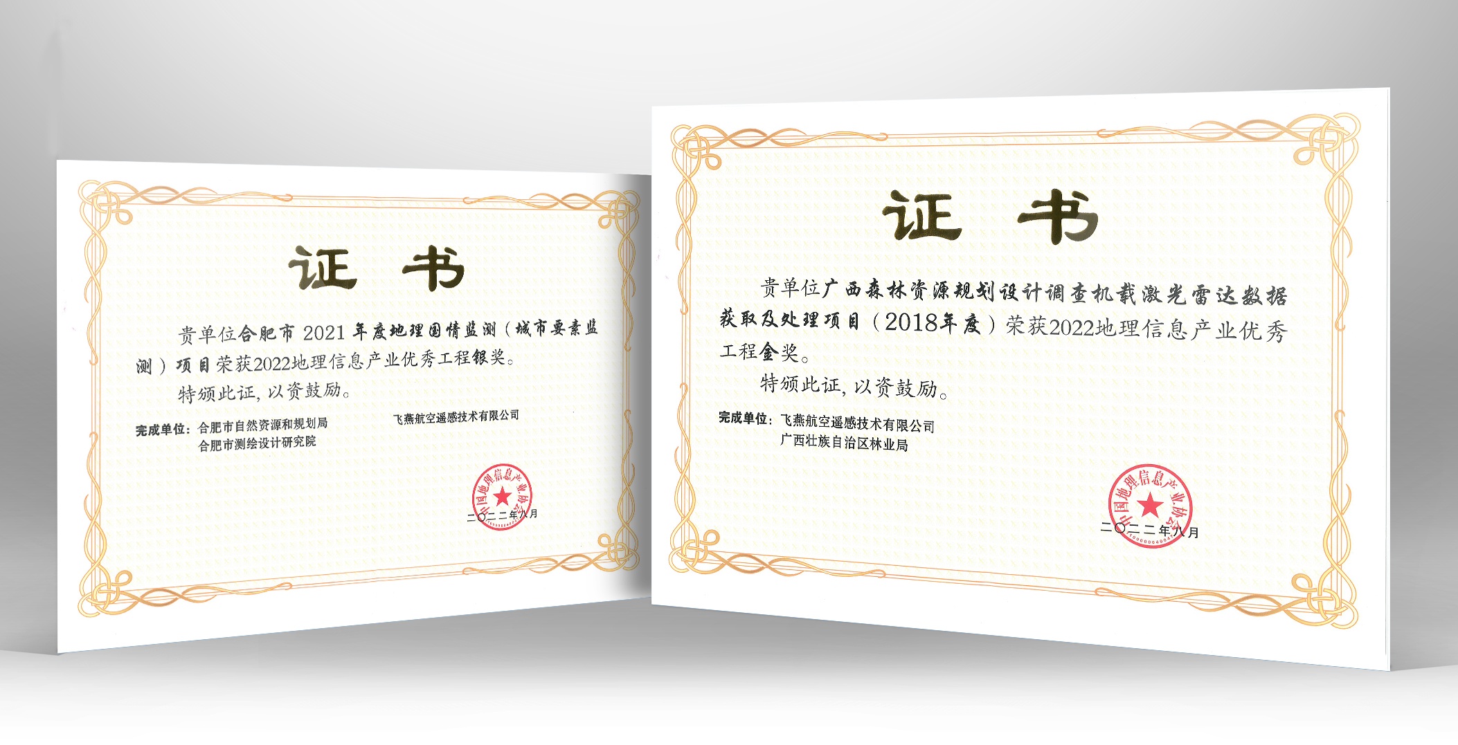飛燕遙感憑借“廣西森林資源規(guī)劃設(shè)計(jì)調(diào)查機(jī)載激光雷達(dá)數(shù)據(jù)處理”和“合肥市地理國(guó)情監(jiān)測(cè)”項(xiàng)目分別榮獲2022年地理信息產(chǎn)業(yè)優(yōu)秀工程獎(jiǎng)金獎(jiǎng)和銀獎(jiǎng)。