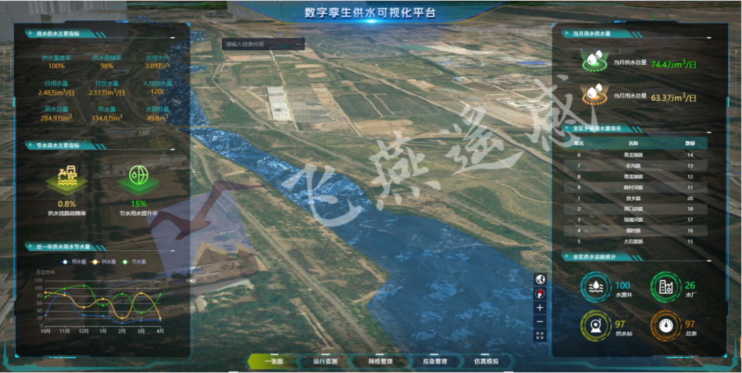 數(shù)字孿生供水平臺(tái),集成數(shù)字孿生技術(shù)、三維可視化技術(shù),通過建模渲染建立水務(wù)設(shè)施的結(jié)構(gòu)形狀和位置關(guān)系,實(shí)現(xiàn)物理對(duì)象的數(shù)字化表達(dá)。打通水務(wù)管理中各業(yè)務(wù)系統(tǒng)的數(shù)據(jù)孤島,實(shí)現(xiàn)水務(wù)工程的三維展示、全過程實(shí)時(shí)監(jiān)測(cè)、故障預(yù)警等,協(xié)助管理者一目了然地掌握業(yè)務(wù)趨勢(shì),獲取數(shù)據(jù)使用價(jià)值,完成高效率管理、運(yùn)營和決策。