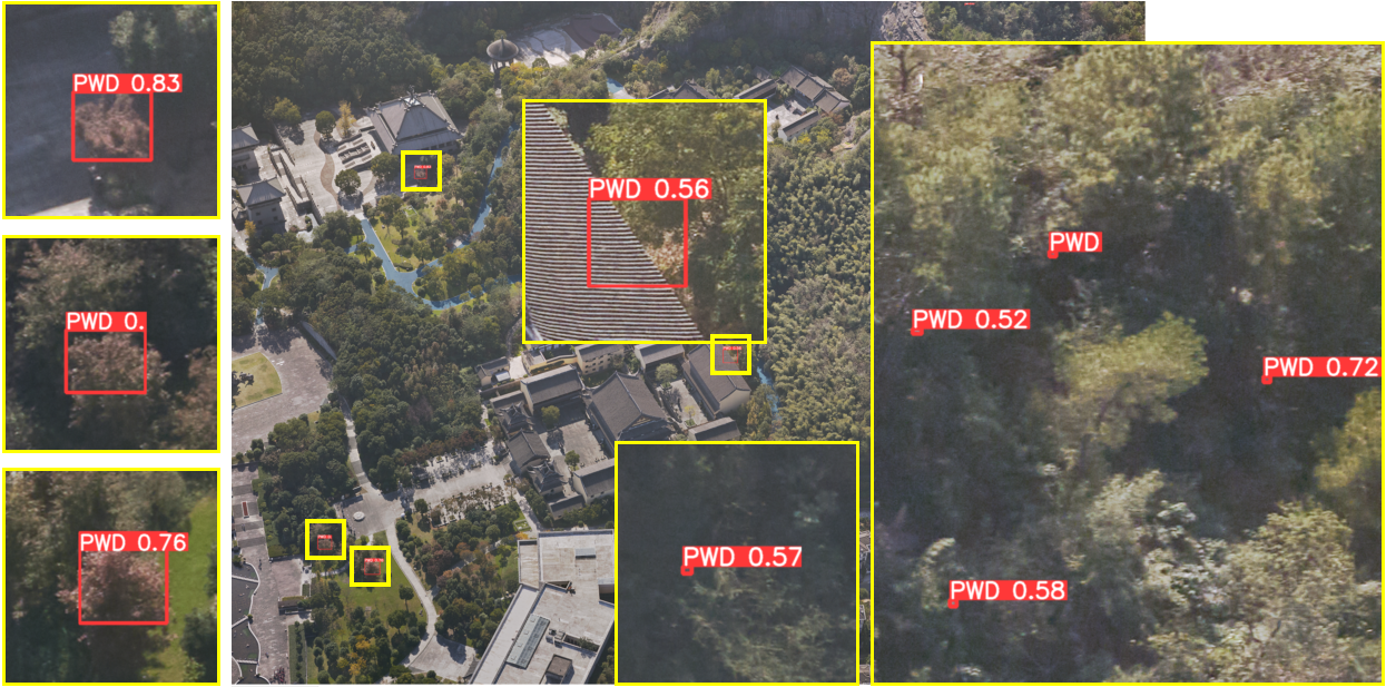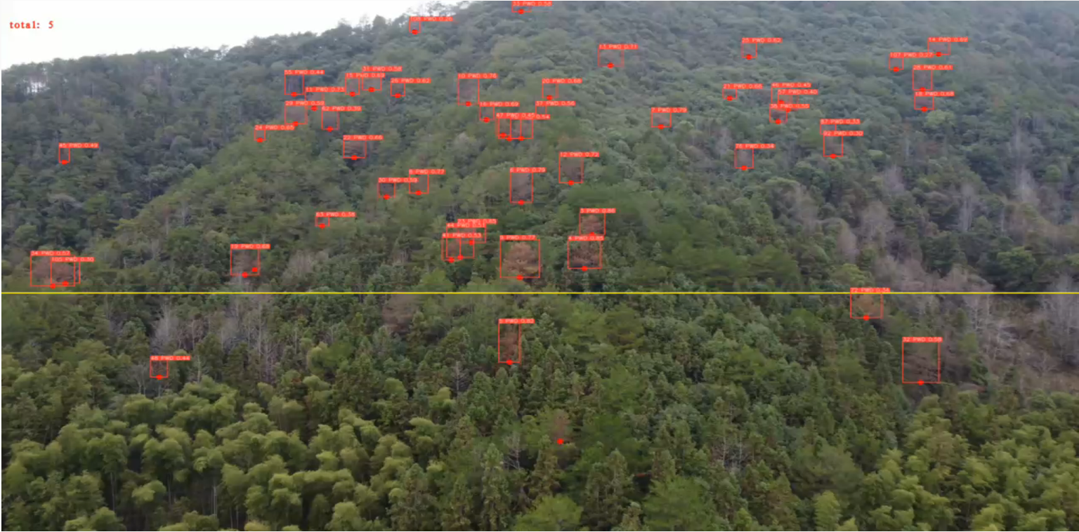 松材線蟲病死樹出現(xiàn)的高峰期在每年的8—10月份,一株松樹感染松材線蟲病最快40天左右就會(huì)死亡。飛燕遙感AI智能識(shí)別方案具有監(jiān)測速度快、識(shí)別準(zhǔn)確率高、實(shí)施成本低的特點(diǎn),能夠及時(shí)發(fā)現(xiàn)松樹異常情況,確保疫情早發(fā)現(xiàn)、早除治。