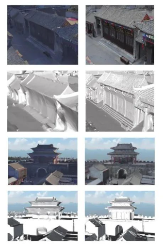傳統(tǒng)傾斜攝影建模由于建筑物遮擋,采集不到房檐下數(shù)據(jù)、紋理覆蓋不夠或白模質(zhì)量差。融合地面激光雷達(dá)掃描數(shù)據(jù)后,房檐下紋理清晰可辨,白模精度大幅提高,模型棱角分明。傳統(tǒng)傾斜攝影建模與多源數(shù)據(jù)融合建模效果對(duì)比如下: