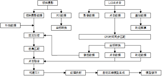 傳統(tǒng)的傾斜攝影在數(shù)據(jù)采集過(guò)程中,存在物體遮擋、航攝盲區(qū)等客觀因素限制,造成三維模型扭曲、空洞、紋理拉花等問(wèn)題?;跓o(wú)人機(jī)傾斜攝影、機(jī)載激光雷達(dá)、地面激光雷達(dá)融合建模的方法,同時(shí)采用大疆無(wú)人機(jī)補(bǔ)拍重點(diǎn)建筑紋理數(shù)據(jù)對(duì)傾斜攝影數(shù)據(jù)進(jìn)行補(bǔ)充,將4種數(shù)據(jù)相融合進(jìn)行實(shí)景三維重建,可以獲得高效率、低成本、精細(xì)化的實(shí)景三維模型。