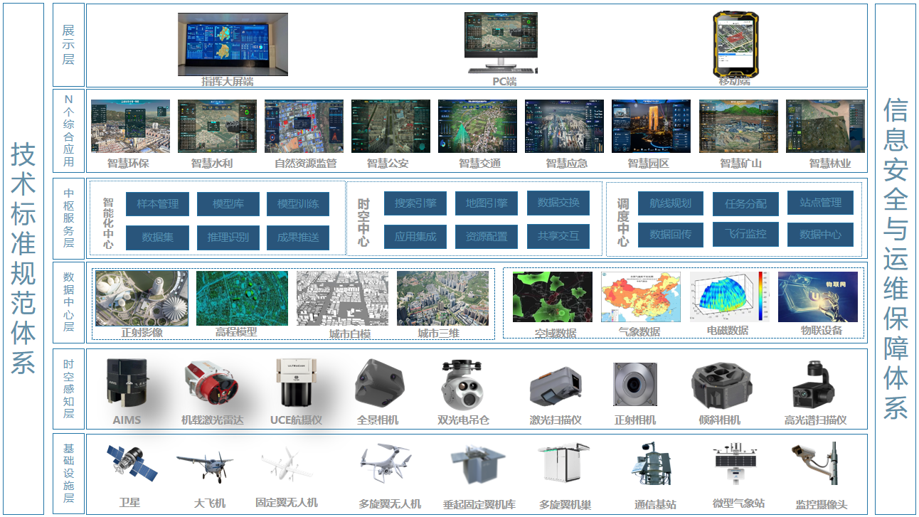 在遙感數(shù)據(jù)獲取方面,針對中高空、低空遙感分別自主研發(fā)了AIMS多模態(tài)航攝儀與“遠(yuǎn)瞰”低空無人值守系統(tǒng)。在一次性獲取所有主流航空遙感數(shù)據(jù)的基礎(chǔ)上,實(shí)現(xiàn)無人機(jī)自動巡檢、自動充電、異地部署、遠(yuǎn)程規(guī)劃指揮、數(shù)據(jù)自動回傳等功能,滿足城市區(qū)劃范圍內(nèi)山水林田湖草沙全場景作業(yè)需求。
