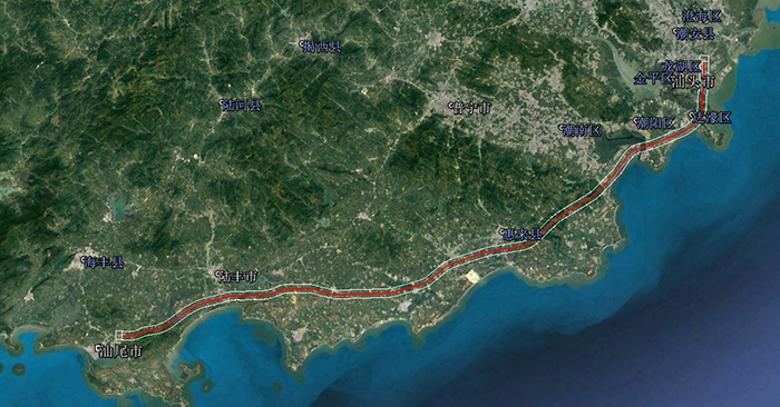 汕汕高速鐵路是廣東省重點(diǎn)工程,也是國(guó)家“八縱八橫”沿海高鐵通道的重要組成部分,由汕頭站至汕尾站,經(jīng)汕頭市(龍湖區(qū)、濠江區(qū)、潮陽(yáng)區(qū)、潮南區(qū))、揭陽(yáng)市(大南海石化工業(yè)區(qū)、惠來(lái)縣)、汕尾市(陸豐市、海豐縣、東涌鎮(zhèn)),終于廈深鐵路汕尾站。正線全長(zhǎng)162.750千米,全線設(shè)7座車站。